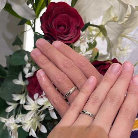 フルオーダーメイドで二人だけのリングを作ることができました。気に入った槌目加工とミル加工で作ってもらいました。色も2色選び、サンプルリングがなかったので受け取るまですごく楽しみで、手元にリングがきたとき、想像以上に素敵なリングで嬉しかったです。