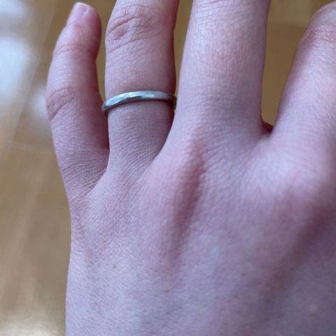 プラチナで飾りがないリングです。とにかくシンプルで着け心地が良く、5年ほど経ち、いい意味で傷もつき深みが出てきました。他のリングとの合わせもしやすいですし、年中つけていますが肌が荒れたこともありません。