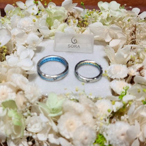 お店にある指輪を参考に、ふたりの要望を組み合わせてデザインしてもらいました。素材も色もデザインも、全てかなり迷った結果、担当のデザイナーさんにも導いていただいてどうにか決めることが出来ました。光源により色のみえかたが変わるのが素敵です。