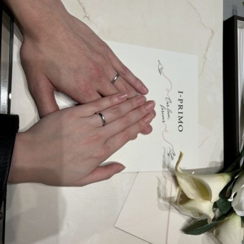 男性のリングは、アイプリモさん独自のマット加工が施してあります。そのため、特別が増します。女性のリングは小さなダイヤが7つあり、派手すぎず、地味すぎないデザインです。手を見ると薬指に目をひく落ち着きがありかつ綺麗さが引立つデザインを選びました。