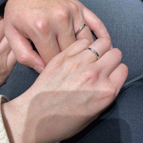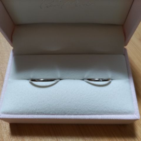 ダイヤモンドの輝きが綺麗で、幅が細すぎずでちょうど良いところに惹かれました。 毎日つけても邪魔にならないデザインのようなので、結婚指輪としての着け心地も良さそうです。 男性用は別のデザイン、1番シンプルなプラチナリングを選びました。