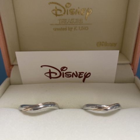 ケイウノオリジナルの2色が絡み合ったデザインに、ディズニーの刻印と名前のデザインをいれました。 指輪の太さや素材(プラチナ・金など)など色々カスタマイズしていくうちに、自分たちだけのオリジナルになって大満足です。