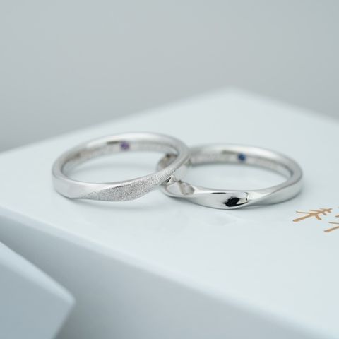 全体のイメージは艷やかなシルバーです。ひねりを入れたデザインにしてフォーマルな時はひねってないシンプルな方にもできるデザインです。妻の方にはひねり部分に小さな石を散りばめてキラキラ輝きます。内側には誕生石が付いています。