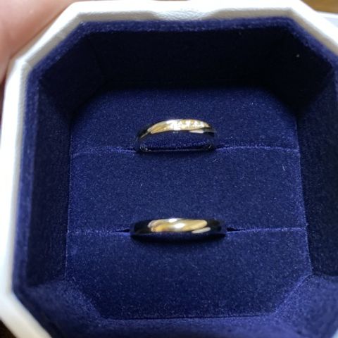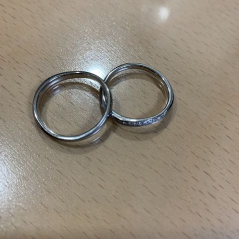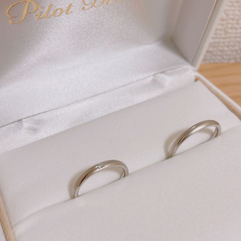 なんと挙式から4個目の指輪です。最初の指輪はデザイン性が高く、凹のところで割れてしまいました。2つ目も亀裂が入り破損。原因として考えられるのは、当時のサイズは主人21号・私9号とかなりの差があるのに同じ値段…主人の指輪が薄かったためだと思われます。3つ目は厚みのある丈夫なものを選んだのですが、あいにく私の指のサイズが変わり、入らなくなってしまいました。そして今回、丈夫なもの!年齢を重ねた指にも似合うもの…私にだけダイヤが付いているものwを、店員さんに勧めていただきました。