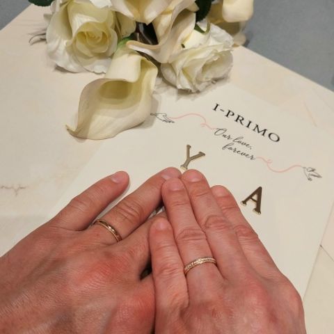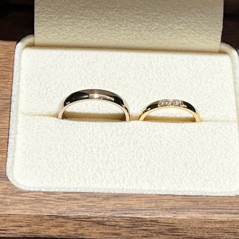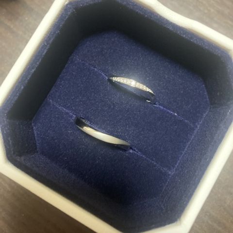 結婚指輪と婚約指輪は重ね付けして普段使いできるものが良かったので、結婚指輪はシンプルなリングを、婚約指輪は代わりにハーフエタニティにしました。婚約指輪にだけ内側にブルーダイヤモンドの石を入れて、結婚指輪は子供が産まれてから子供の誕生月の石を入れるつもりなのでとても楽しみです。
