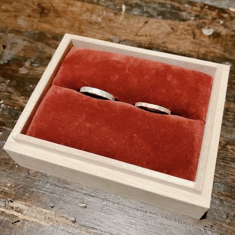 プラチナの指輪に槌目加工とスターダスト加工をそれぞれ入れました。ななめにエッジを入れてお揃い感をだせるようにしました。スターダストのキラキラがお気に入りです。2人でデザインを考える過程がすごく楽しく、一生忘れないと思います。