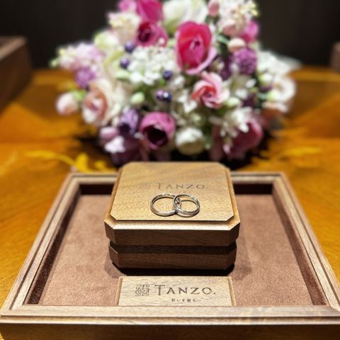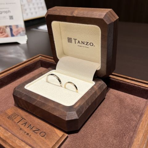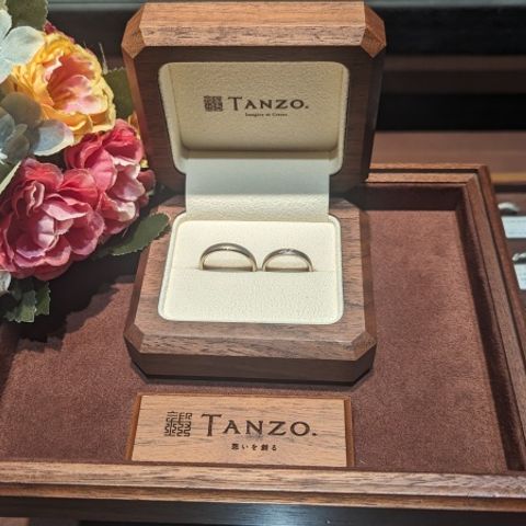 まず婚約指輪と綺麗に重ね付けがしたいので、結婚指輪と婚約指輪は同じブランドにしようと思っていました。 プロポーズでダイヤのルースを頂いたので、ダイヤの持ち込みが可能なTANZOさんに決定しました。 (夫の名前の響きとブランド名が似ていたので、お付き合いしていた頃から候補に入っていました) 鍛造製法だと丈夫で石落ちしにくいらしく、キラキラが好きなのでダイヤは入れたいと思っていました。 エタニティも惹かれましたが、嫌味のない3石に。 凄くキラキラ輝いていて、大粒に見えるし大満足です。 地金の色は、妻(私)はイエローゴールド・夫はコーラルゴールドにしました。 イエローゴールド以外にコーラルゴールドかシャンパンゴールドかも散々悩みましたが、決めきれなかったので、普段のアクセサリーがゴールド系なのと、アレルギー体質のため念のため割金の素材を確認し、イエローゴールドにしました。 夫は私に寄せてくれてコーラルゴールドにしました。(イエローゴールドは恥ずかしいとのこと) ピンク系というと可愛らしいイメージがありましたが、とても深みのあるシックな色で、色黒の肌に合っています。男性にも凄くおすすめな色だと思います。 私もコーラルゴールドにすればよかったと思うほどです(笑)
