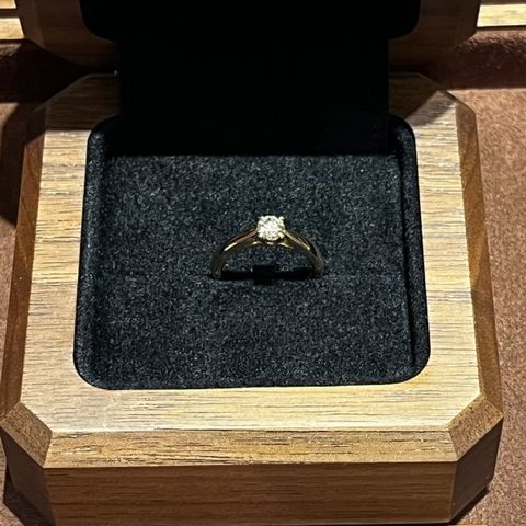 まず、他店で購入したダイヤを持ち込みできるのが決め手でした。 プロポーズでダイヤのルースを頂いたのですが、ダイヤを購入した店舗ではしっくりくるデザインが無く…(申し訳ない…) 指輪の色やデザインを細かく決められます。 私はプラチナ以外の色が良くて、シンプルで華奢なデザインで、結婚指輪と重ね付けできて、ダイヤが輝いて見えるデザインが良いと考えていました。 他店の指輪を試着した時に、結婚指輪と重ね付けした際にできる隙間が気になっていたのですが、二段腰という高さの出るデザインを提案していただけて解決しました。光が入るのでダイヤも輝きます。 また丈夫な鍛造製法なので、高さのある爪留めデザインでも安心です。 アームの細さや、ダイヤに向かって絞られていく角度も細かく希望できます。 地金の色が沢山あり、コーラルゴールド・シャンパンゴールド・イエローゴールドで悩みました。 どれも上品で綺麗な色で決めきれなかったので、割り金の素材を聞いて、イエローゴールドに決定しました。