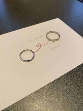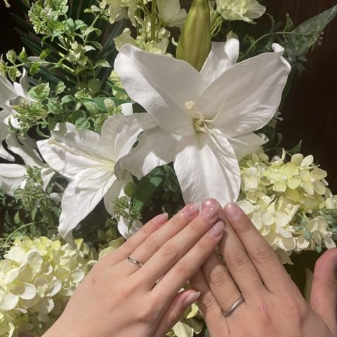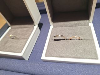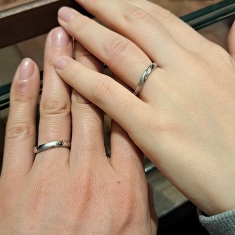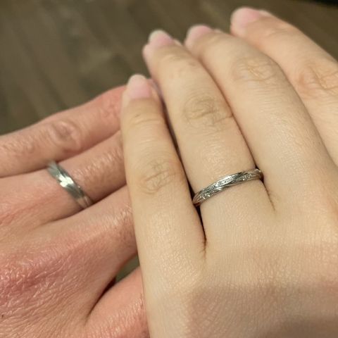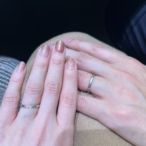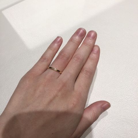 5ブランドほど周りましたが、最初に見たこちらの指輪の付け心地が忘れられず決めました。私はゴールド、彼はシルバーで色違いを希望していたので、お揃い感が欲しくて控えめなデザインに惹かれました。小さいながらも小さくキラキラ輝くのがお気に入りです。