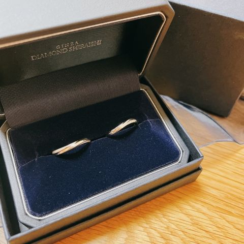 自分の好みの色とデザインを形にしてもらいました。 夫婦で全く同じではないけれど、ウェーブのデザインであったり、流れるような形は共通しているものにしていただきました。また、マット、ダイヤは個々の好きな物にしました。