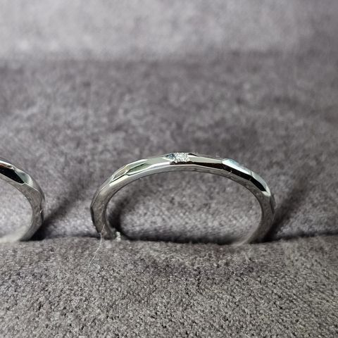 レガーメのデザインをベースに、男性のものは表面の一面にヘアラインかこう、女性のものはダイヤバー加工を入れました。表面にダイヤモンドを入れたくなかったので、裏面にツインダイヤを入れました。婚約指輪は無しの予定なので、結婚指輪の表面に細めのダイヤバー加工を入れることでさりげないキラキラ感を表現しています。