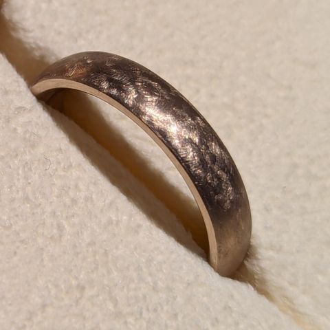 セミオーダーの細工が基本のブランドなので、自分だけの指輪を作ることができます。この指輪はコーラルゴールド・アイスマット加工のもので、3.5mm幅です。 当初はプラチナで検討していたものの、シルバーともゴールドとも相性の良さそうなコーラルゴールドに一目惚れし、そちらを選択しました。コーラルとはありますが、実際の色味は桜色に近い優しい色です。