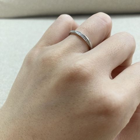 斜めに3つメレダイヤが並んでいて、かつ斜めのラインが入っているデザインがシンプルなのにかわいくて一目惚れしました。似たようなデザインもあり、悩みましたが最後はこれ一択ってくらい気に入りました!細身で着け心地もいいです。