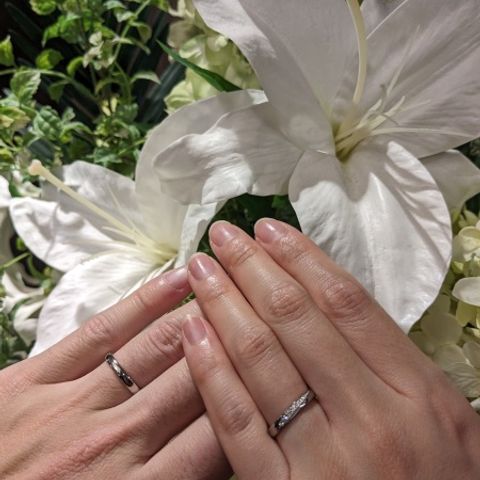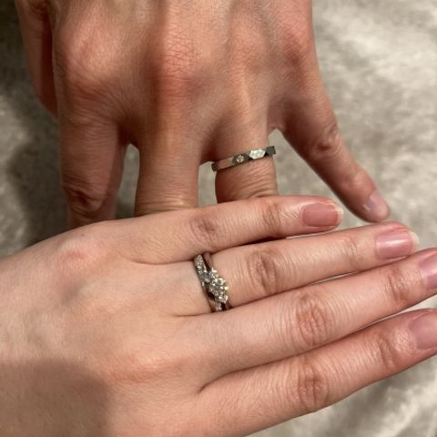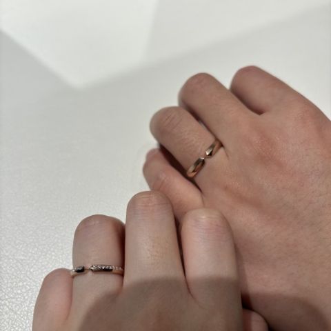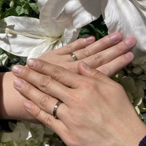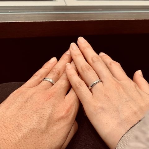 強度のある素材であることと、手が綺麗に見えるようなデザインになっている点が決め手になりました。 夫婦で同じデザインにする予定は元々なかったので、お互いが好きなデザインを選んだ結果、今回の指輪になりました。 どんな組み合わせでも素敵だと思います。