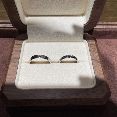 フルオーダーで細かいこだわりにも店員さんが親身に対応してくれました。 夫婦で欲しい指輪のこだわりポイントや似合う形状が異なっていたのですが、それぞれの満足のできるデザインにすることで満足度は下げませんでした。 代わりにダイヤをそれぞれ入れることでペア感を強調し、そのためにダイヤのサイズを同じにするようにこだわりました。