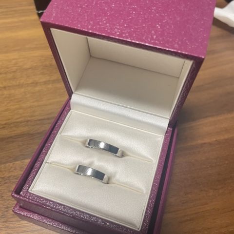 結婚指輪として利用させて頂きました。歳を重ねても飽きないシンプルなデザインがいいと感じました。色もシンプルなシルバーを選びました。また、奥さんに関しては婚約指輪を重ねてつけても違和感のないようリングがストレートタイプを選びました。