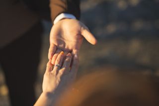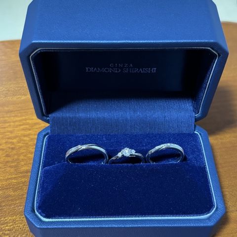 シンプルかつ自分達のこだわりに合わせた、いつまでもつけられるデザイン。 私は指が太いので、V系デザインの付け外しやすさとシーンを選ばないシンプルさは好みに合いました。 妻はさりげなく散りばめられたたくさんのダイヤがキラキラと綺麗な一品。 私はシンプルながら本体の煌めきが光に映える一品。