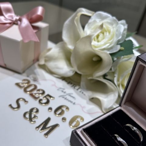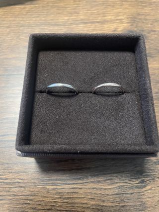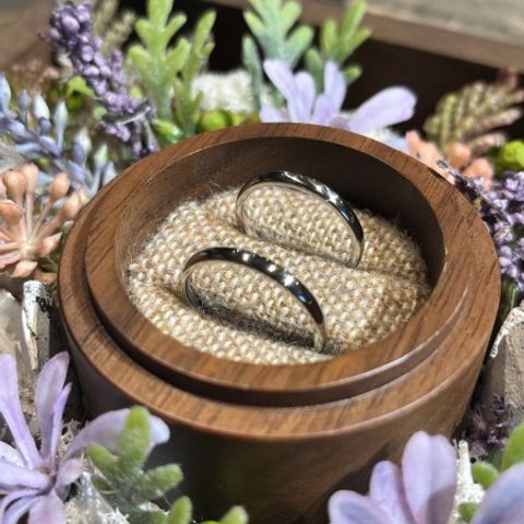 【デザインについて】 2人で幅3mmの平甲丸を選択しました。 平打ちと悩みましたが、飽きのこないシンプルなデザインに決めました。 丸いデザインなため、物に引っかけたり、エッジの部分のキズが目立ちにくいと思います。 指輪の内側には婚約日と2人のイニシャルを刻印しました。