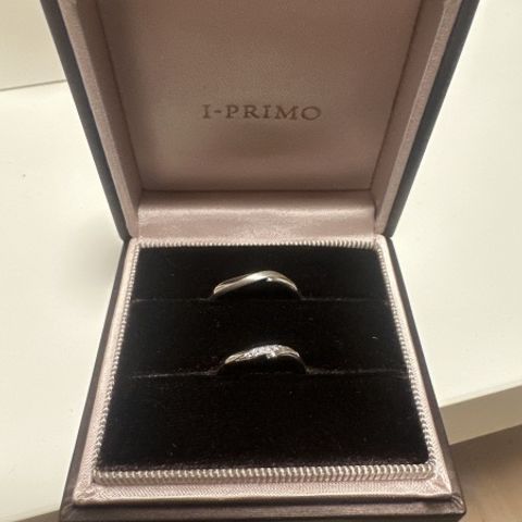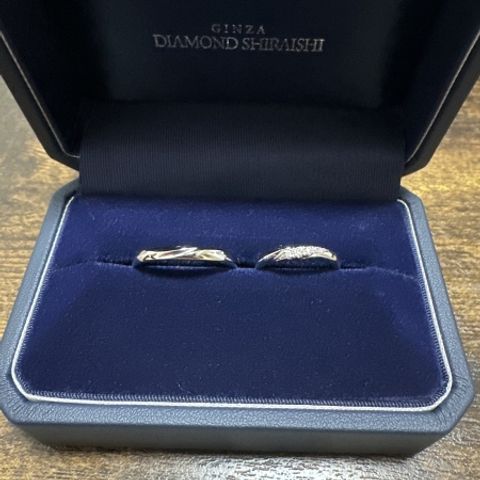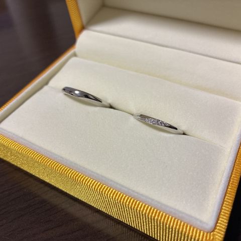 女性用の指輪は、斜めのラインにダイヤが散りばめられていて、妻好みのピッタリなデザインでした。 男性用の指輪は、シンプルなデザインではありながら、ツヤの有るところと無いところのちょっとした違いがとてもおしゃれでした。