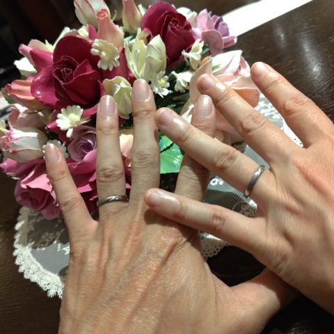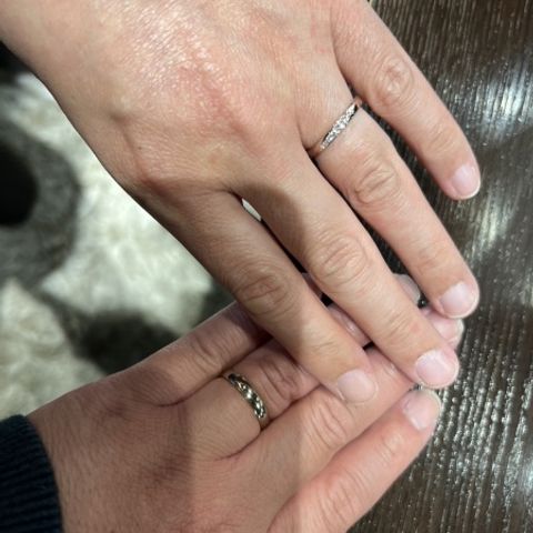 女性の手に似合う指輪を一生懸命に探しました。とても指にフィットしてて、指がとても綺麗に見えます。男性の方は、指が太いので、指輪を極力太めにして、指をスッキリ見えるようにしました。極力太めにしたおかげでとても良い感じになりました。
