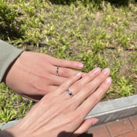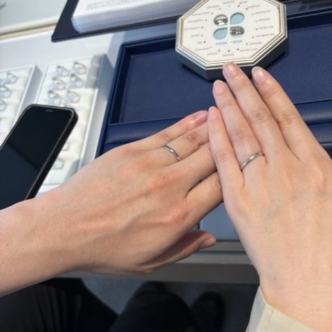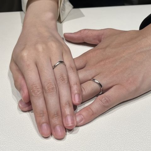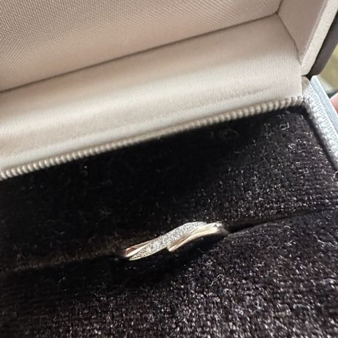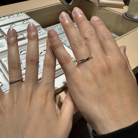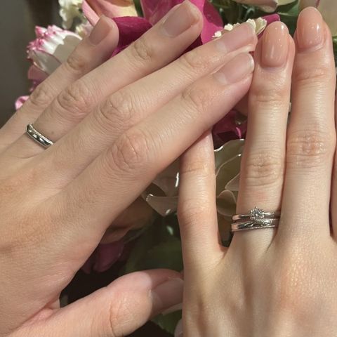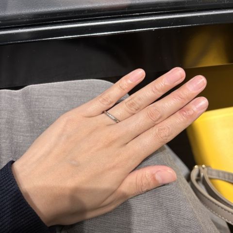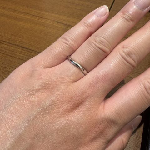 普段使いしやすいものを選んでもらいました。 華やかなタイプの雰囲気のものはあまり好きではないので 細くて小さいものがドンピシャです。 ストレートの形なので重ね付けも楽しめるのがポイントだと思います。結婚指輪との組み合わせを考えるのが楽しいです。