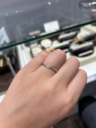 婚約指輪をいただいたのが、ここのブランドだったので、婚約指輪と合わせやすいかなと思いここのブランドに決めました。 デザインはウェーブで、側面に装飾が施されています。 シンプルで職場にもつけやすいデザインです。