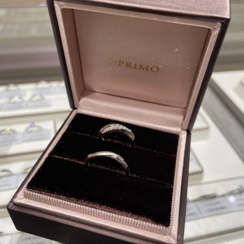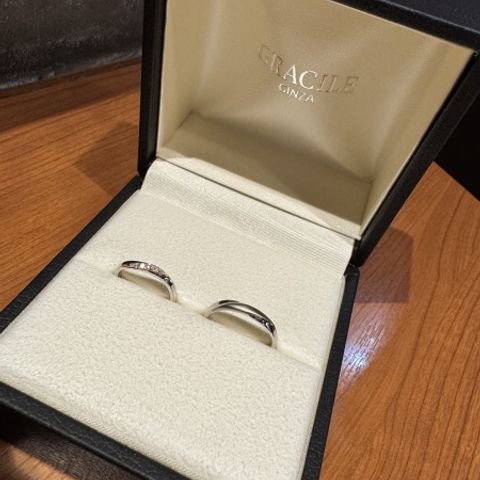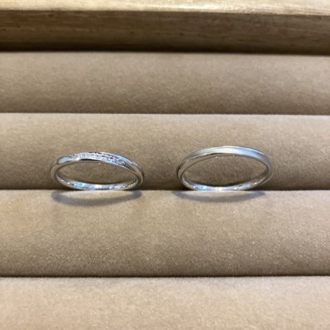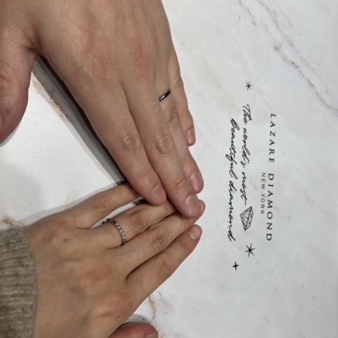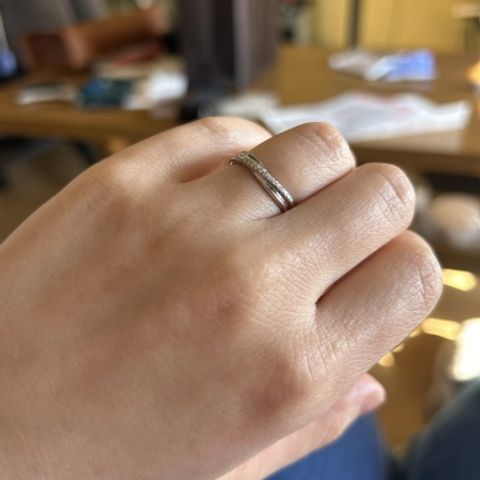 指輪のデザインがウォーブで指に合う形です。小さなダイヤが並んでいてキラキラもあり、でも主張しすぎていないので長く身につけられると思います!彼のデザインはダイヤモンドダスト加工と幅を広げたので他に無いデザインをオーダーできたので唯一のペアの組み合わせになったと思います!
