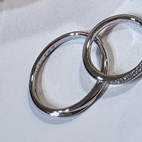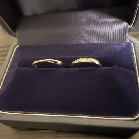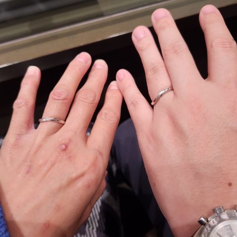 シンプルだけではなく輝きがあり特別感もあります。 どこでも毎日つけやすく品のある素敵な指輪です。 私はツヤのあるままの指輪にしました、主人はツヤけし加工にしたので選択できたのも良かったです。 素材も選択できてので肌馴染みのいいホワイトゴールドを選びました。