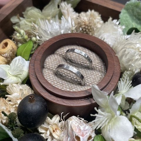 1本のプラチナ棒を自分で打ち付けて槌目模様をつけ、バーナーで接着させやすりで磨き…とても思い出に残る指輪になりました。特に、お互いの指輪をお互いが作れたことが一番よかったです。仕上げの刻印も、レーザープリントではなく彫刻機を使い1文字1文字掘っていく工程も素敵でした。