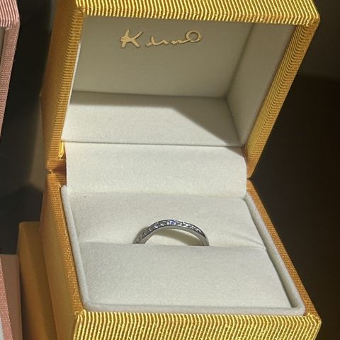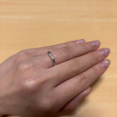 爪でダイヤを固定している立派なリングだと毎日高いしにくいのと,洋服に引っ掛けたり家具にぶつけたりするのを避けたいのでエタニティリングを選びました。結婚指輪と重ね付けを普段からしたいので、結婚指輪のウェーブのカープと合うように角度を調整してもらいました。