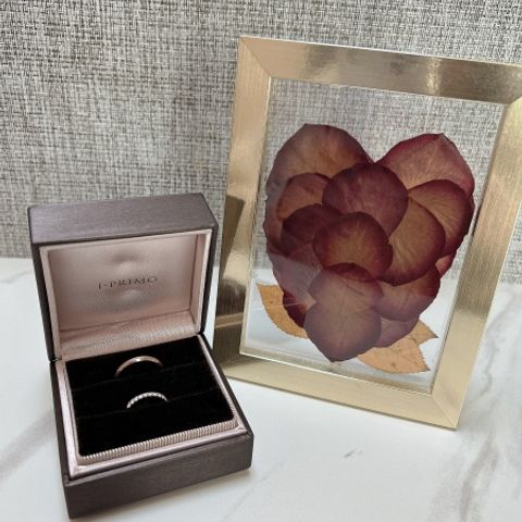 光のもとでキラキラと輝き、ナチュラルかつ華奢なデザインだけど存在感があります。ピンクゴールドは男女ともに肌馴染みがよく手も綺麗に見えて良いです。派手すぎず、それでいて2人の個性が出せるデザインだと感じて2人で決めました。