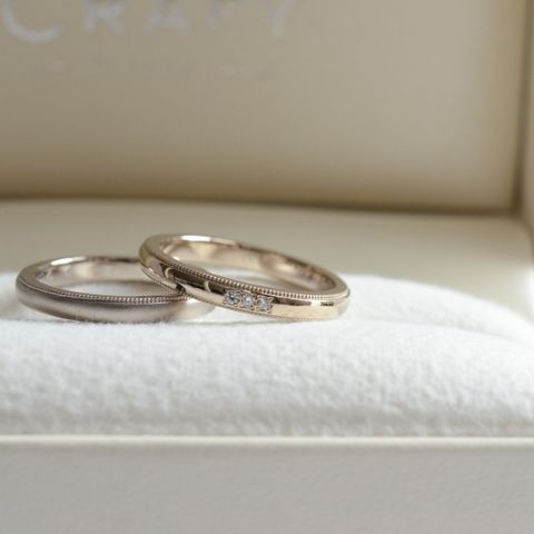 婚約指輪はシンプルながらダイヤの大きさを少し大きめにして目立つようにし、結婚指輪のデザインは婚約指輪に対してシンプルすぎないデザインで、重ね付けをした時により一層ふたつともが目立ち、とても気に入りました。