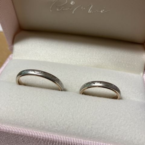 ウェーブの形をしていて、太すぎず細すぎず、日常使いできる、シンプルだけどオシャレなものを探していました。色味に悩んでいたところ、シルバーとペールブラウンの両方の色が入っているデザインを提案していただき、彼とは同じデザインで色違いにすることにしました。ノクターナルは、内側に星の形のダイヤモンドが入っているところがポイントです。