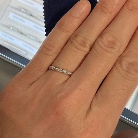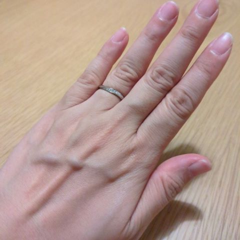 華奢なラインとダイヤが手元を綺麗に見せてくれます。 少しダイヤが多過ぎるかな?とも思いましたが、何度見ても可愛い♡♡と思える、着け心地も軽く、アレルギーに関しても相談にのって頂き、大満足の指輪を選ぶことが出来ました。