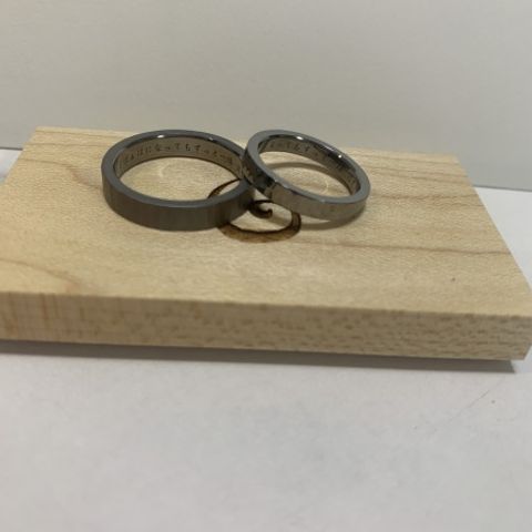 セミオーダーでリング上面をマット(ホーニング加工)で、その他の部分は鏡面仕上げにしていただきました。 上面全てがピカピカだと指輪だけ目立ってしまうイメージがあったため、一部をマットにしたことで、ぐっと印象が変わり、肌馴染みが良くなっていると思います! デザインの調整をはじめ、リングの太さも選べるため、自分好みの太めで作成いただきました。 内側には2人の名前と共に暮らしている猫ちゃんの名前を入れられたので、最高にお気に入りです!
