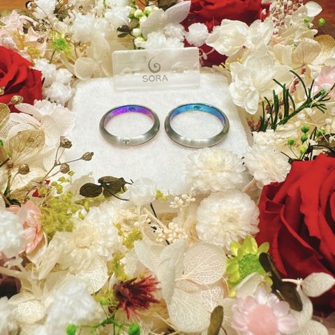 一般的な“銀色”じゃない指輪が欲しくてSORAに行きました。 ピンクゴールドなどでも見た目的には良いのですが、金属アレルギーがあり不安だったので… グラデーションにしてもらい、満足しています。 私はツヤあり、夫はツヤ消しにしました。