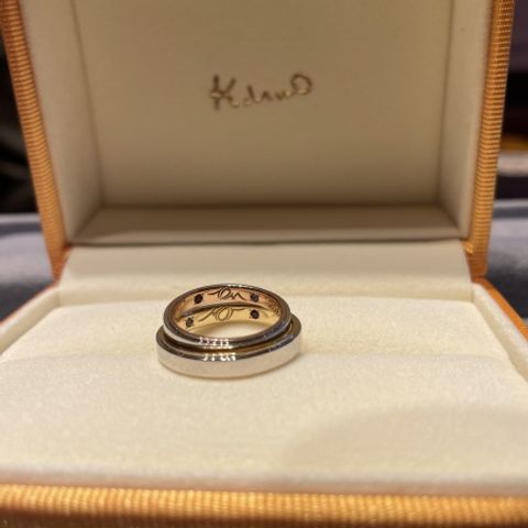 ツートンカラーでプラチナ&ピンクゴールドを選択、パートナーはプラチナ&ピンクゴールド(マット加工)を選択しました。また女性用はダイヤがふた粒入りますが片方をピンクダイヤにしていただきました。色やダイヤの組み合わせができ自分たちだけの指輪を選べた特別感が嬉しいポイントです。