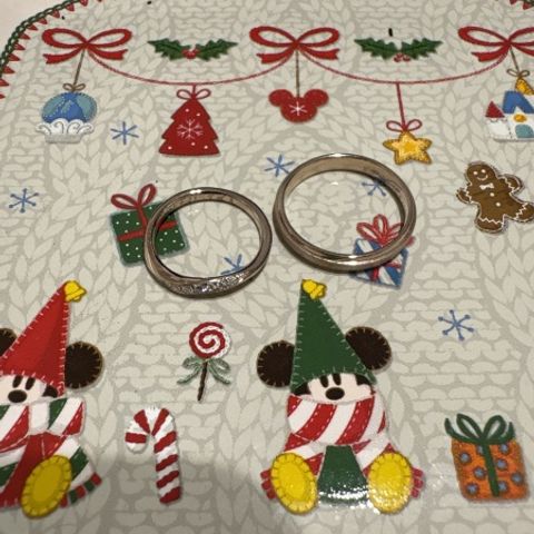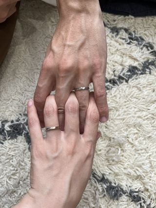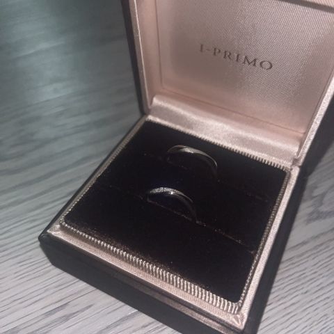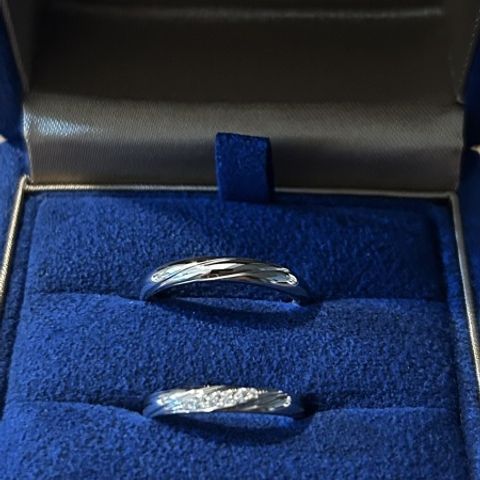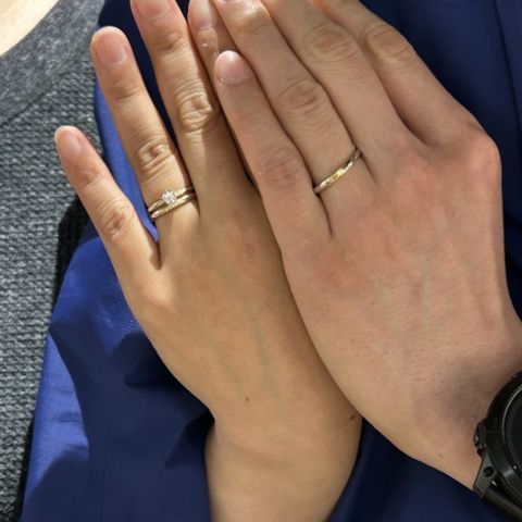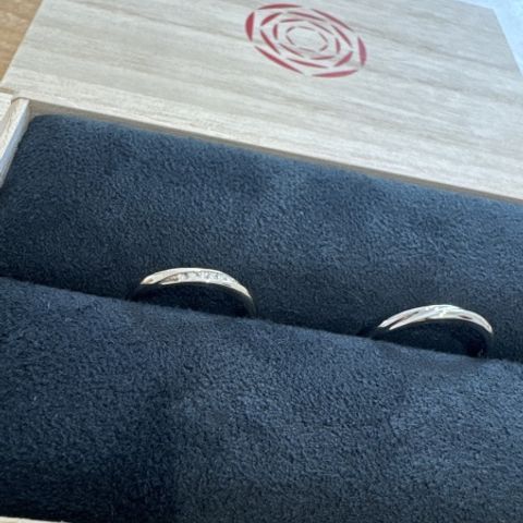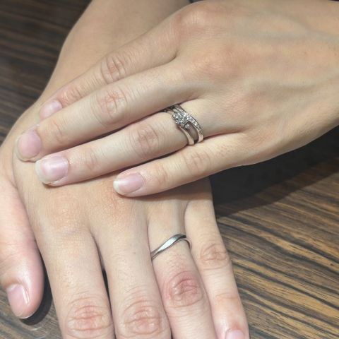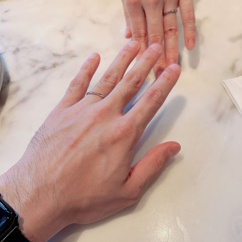 お互いのこだわりとして、鍛造作りでシンプルなものが良いという前提で指輪探しをしていました。夫婦共に水かきが深いと診断いただき、ウェーブタイプが似合うとアドバイスを受け、そのデザインに絞りました。鍛造作りでウェーブタイプは難しい作りとのことでしたが、各々納得のいくリングを見つけることができました。私は小さなダイヤモンドが正面に一つあるもの、彼は真ん中に一部マット加工が施されたものにしました。