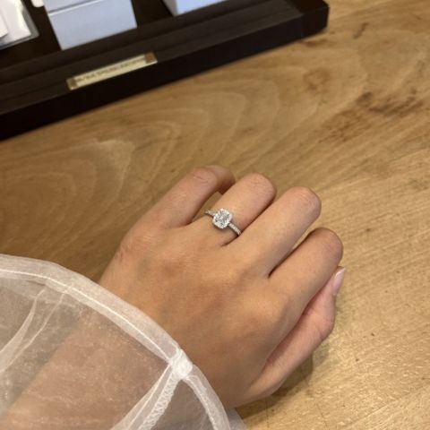 あまり他にはないデザインで、個性的だと思います。エメラルドカットの婚約指輪を探していたのでこの指輪と出会えて良かったです!エメラルドカットの指輪だとVカットでないと重ね付けが出来ないとおもっていましたが、この指輪は重ね付けできる所も魅力的です。
