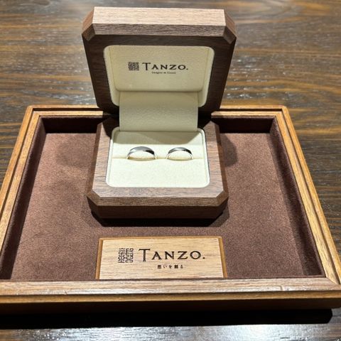 シンプルですが一部だけ組木を混ぜることでポイントを作りました。また2人で全く同じ色にせず、それぞれの私服に合わせやすいようにカラーをチョイスしました。自分の肌に馴染む色で作れたのがかなりよかったです。値段は少々張りましたが、妥協がなくお気に入りの指輪になりました!