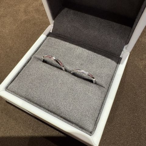 始めはウェーブの指輪を探していたのですが、婚約指輪がソリティアリングの立て爪タイプだったのでV字まではいかないゆるやかなカーブのU字リングを選びました。パーソナルハンド診断で彼にも私にも似合うリングだと紹介してもらえて、私達の好みにも合っていたのでとっても満足しています。私は仕事の関係でキラキラした指輪は選べないな、と思っていたのですがやはり自分が1番可愛いと思うものにしました。ダイヤが数粒埋め込まれているのですが派手な光り方をせずチラチラっと光るのがとっても可愛いです。また、「アルテミシア」は月の女神、という意味だそうで…個人的な話にはなりますが指輪を検討している間ポケモンスリープというアプリで月に関連するポケモン:クレセリアのイベントがやっていたのでこれは運命だ!と思い購入しました。