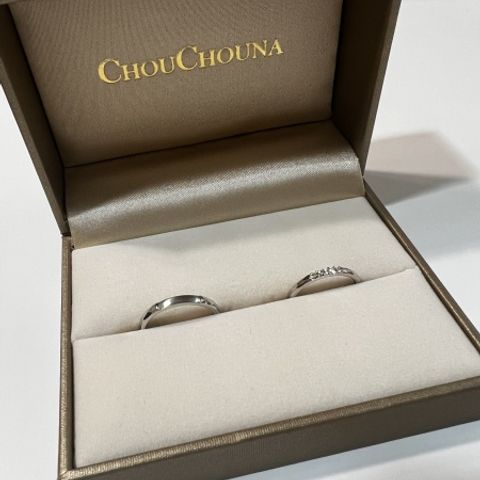 おたがいの好きなデザインを大事にしつつ、ペア感も大切にしました。男性側がマットな素材で、女性側も半分マットになっています。また、女性側は目立ちすぎないけど見るたび気分が上がるようなダイヤの入り方を大切に選びました。