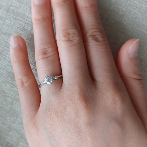 普段から重ね付けしやすいけども存在感のある指輪です。 ダイヤの質にこだわって選びました。 大きすぎると普段使いがしにくいけど、小さすぎるのも嫌だったのである程度の大きさのダイヤで輝きを重視しました。 またリングの部分にもダイヤが付いているので、とても華やかな印象になります。