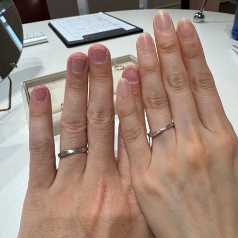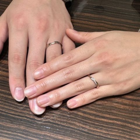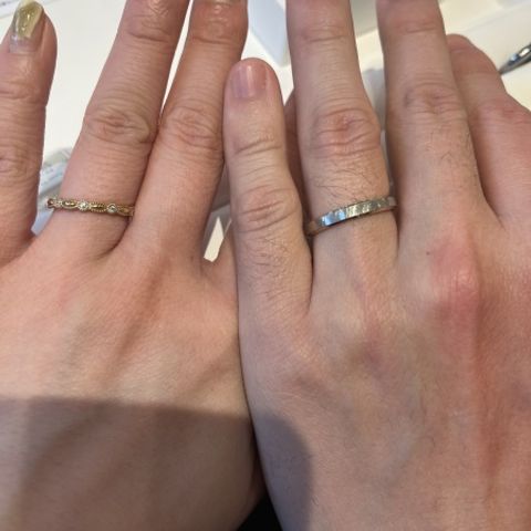 最初は少しゴールドが入ると、派手になるのではないかと余っていましたが、プラチナにゴールドが入ると、指にすごく馴染んで、デザインもおしゃれで、誰がみてもお揃いだと思える指輪でした。シチュエーションによって、指輪の見え方も違うので、そういった部分も楽しめるなと思いました。