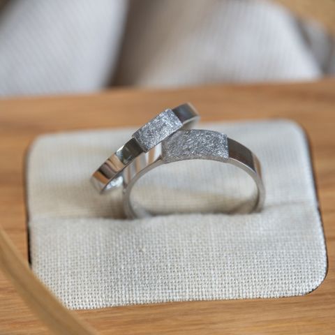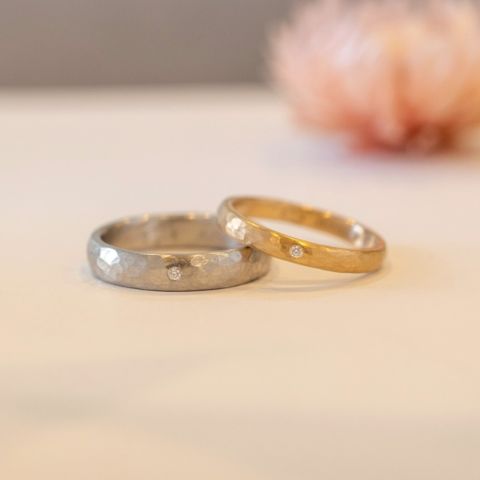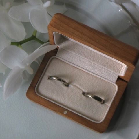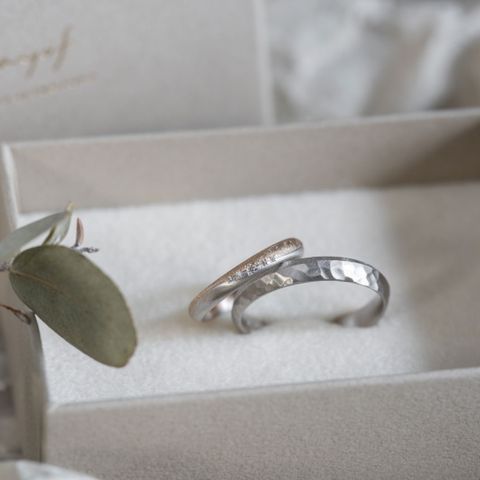 同じデザイン(ひかり)で素材と表面加工を変えました。 お互いのこだわりを素材と加工で表現できたので愛着の湧く指輪に仕上がりました。 今回は出雲に縁があったため、購入を決めましたが それがなくてもここに決めて良かったと思います。
