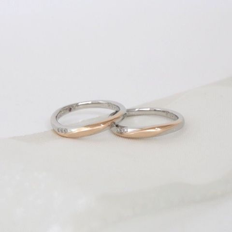 ウェーブでプラチナ、ピンクゴールドのコンビネーションになっており、プラチナ部分にメレダイヤを3つ入れられる リングの内側にお互いの誕生石を入れ、名前の刻印も入れたことで唯一無二のデザインになった また1本15万以下で買えるところ