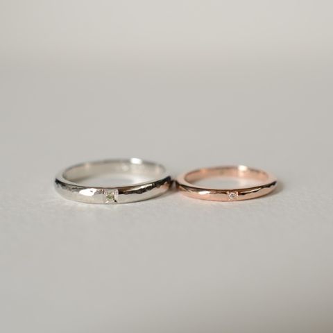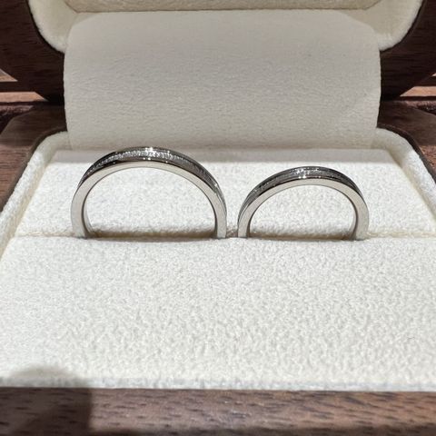 ダイヤが思ったよりも大粒で存在感があり、自然光でもかなりキラキラ輝いてくれます。 男性の方は、マットな部分がチャームポイントになり、一癖あるリングです。どちらも新しく人気のデザインだそうで、一眼見た瞬間から気に入りました☺︎