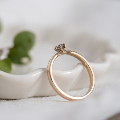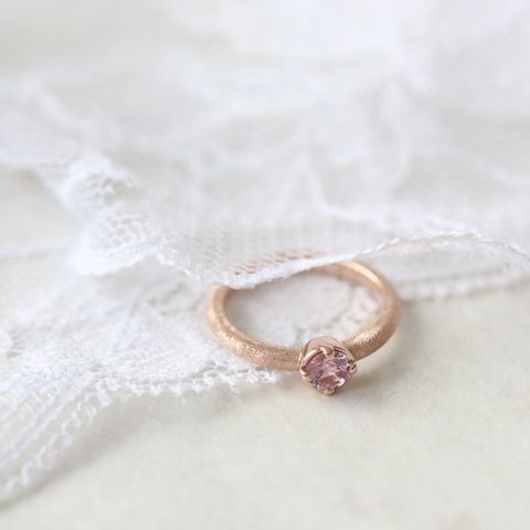 星空の下でプロポーズされ、自分の名前に"実"が入っているのもあり、自然をテーマにした婚約指輪にしたいと思っていました。 素材をピンクゴールドにして木をイメージしつつ、ピンクサファイアを包み込むデザインで木の実をイメージ、表面をスターダスト加工することで星空をイメージしました。とても素敵な指輪を作っていただきました。