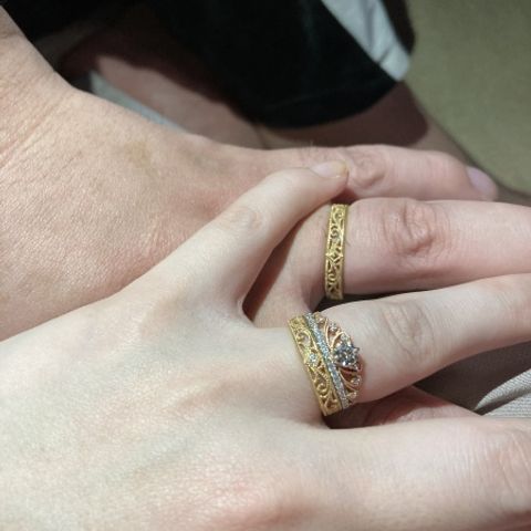 とても綺麗でペア感があり 婚約指輪とマッチしていました。唐草模様でゴールドがとても綺麗です。肌なじみも良いので毎日つけていられます。私は婚約指輪とよく合っていました。旦那とのペア感が気に入っています。