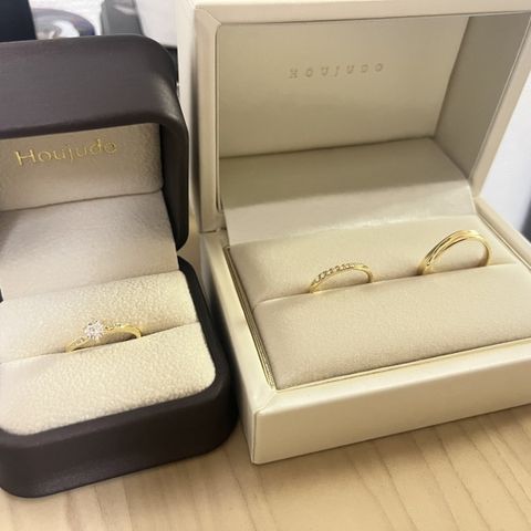 エンゲージリングとマリッジリング両方を、日常的に着けられるように選びました。 重ね付けできるデザインで、インパクトがありつつも肌に馴染む色で作りました。 ふたりともの譲れないポイントをすべて詰めていただきました。